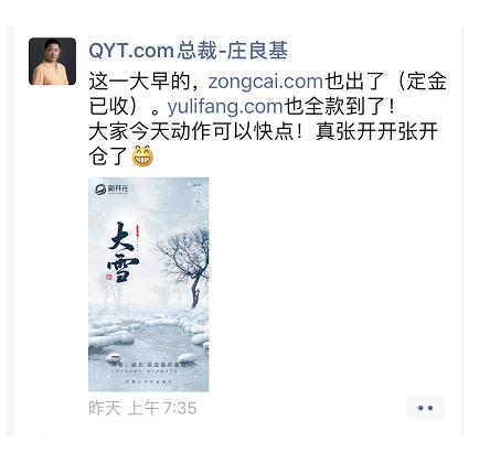 據(jù)了解,賣家是著名的域名投資專家莊良基,為了給自己在今年雙十一啟動的新項目“企友通(QYT.com)”回籠資金,開始開倉特價出售一批域名,其中雙拼域名zongcai.com已經被人預定,定金已經到賬。三拼域名yulifang.com已交易完畢。此外,還有5個域名已經打包100多萬交易。前日中午12點左右,還有一枚雙拼域名50萬價格交易,具體域名不知。