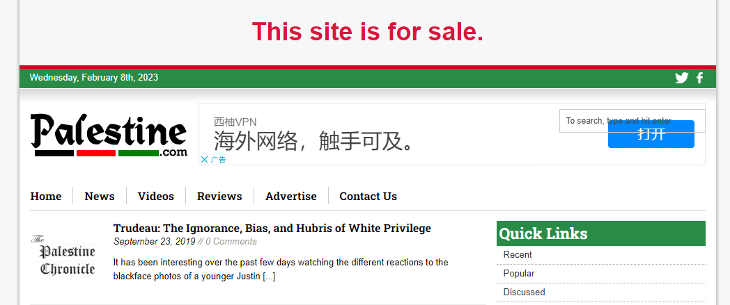 據(jù)了解,域名Palestine.com原來是記錄巴勒斯坦相關(guān)資訊新聞的網(wǎng)站,目前訪問該域名,仍能看到該網(wǎng)站上方標(biāo)注的“This site is for sale.(此網(wǎng)站正在出售)”。